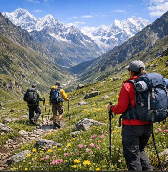 Trekkers exploring the stunning alpine meadows of the Himalayas